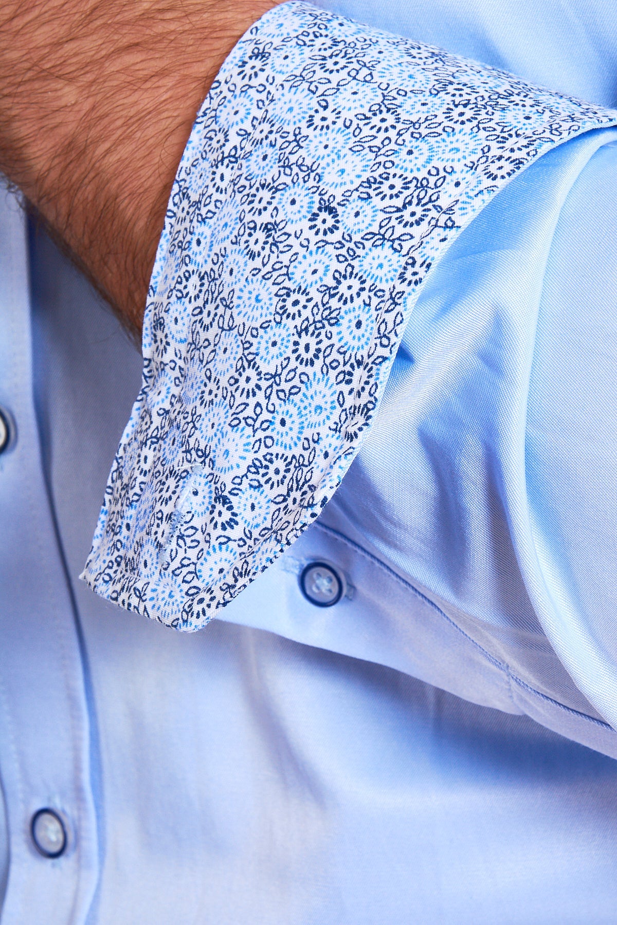 This timeless sky blue collared shirt works perfectly for office attire or as a stand alone feature. The floral detailing to the button trail, inner collar and cuffs gives it character and diversity and the 50% cotton blend fabric will keep you comfortable all throughout the day.