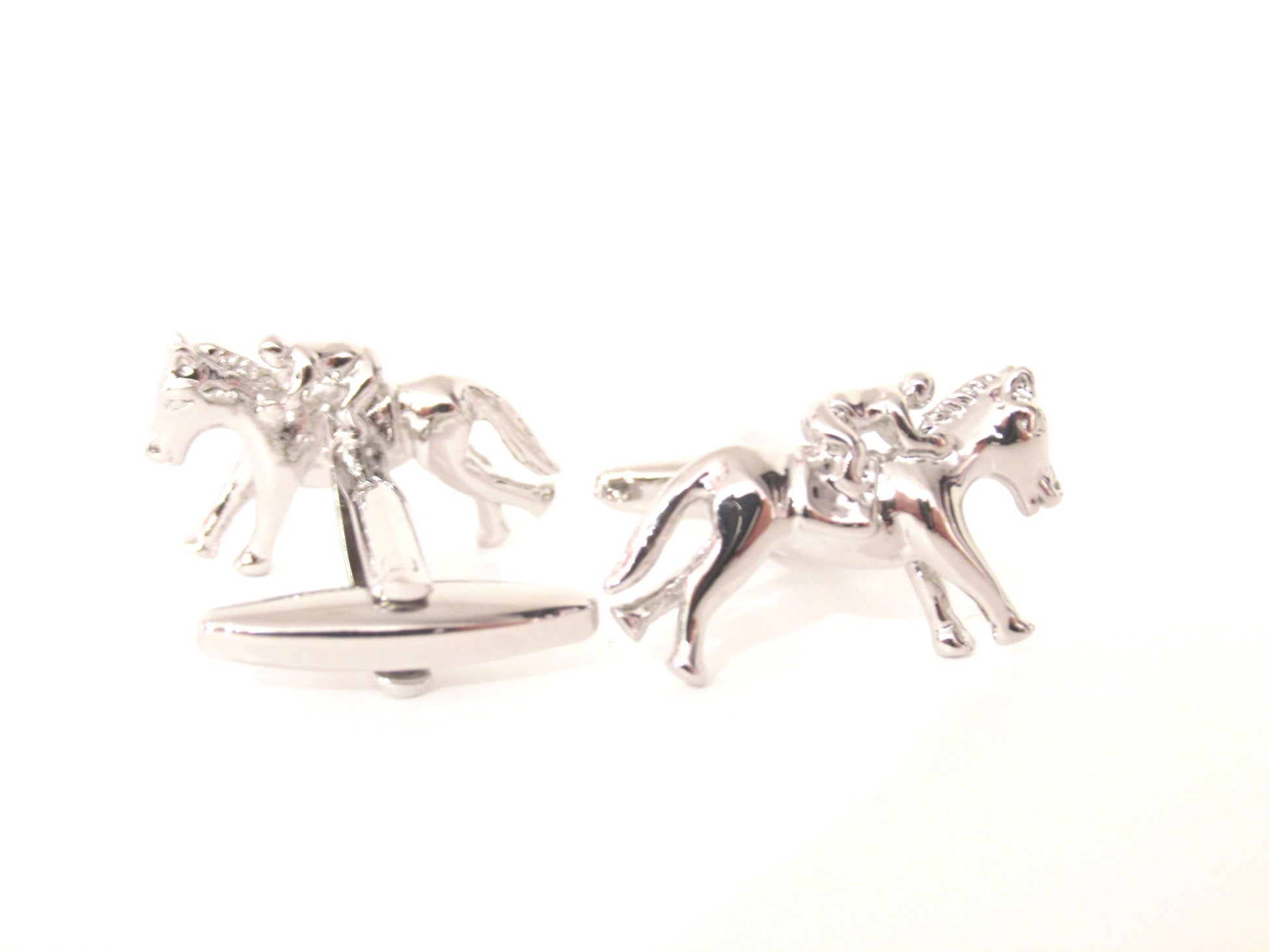 A pair of silver plated cufflinks with a silver horse racing with a jockey riding it. These are a stunning pair of links that will bring a unique sense of style to any suit they are worn with. The perfect accessory to complete your look for the races!